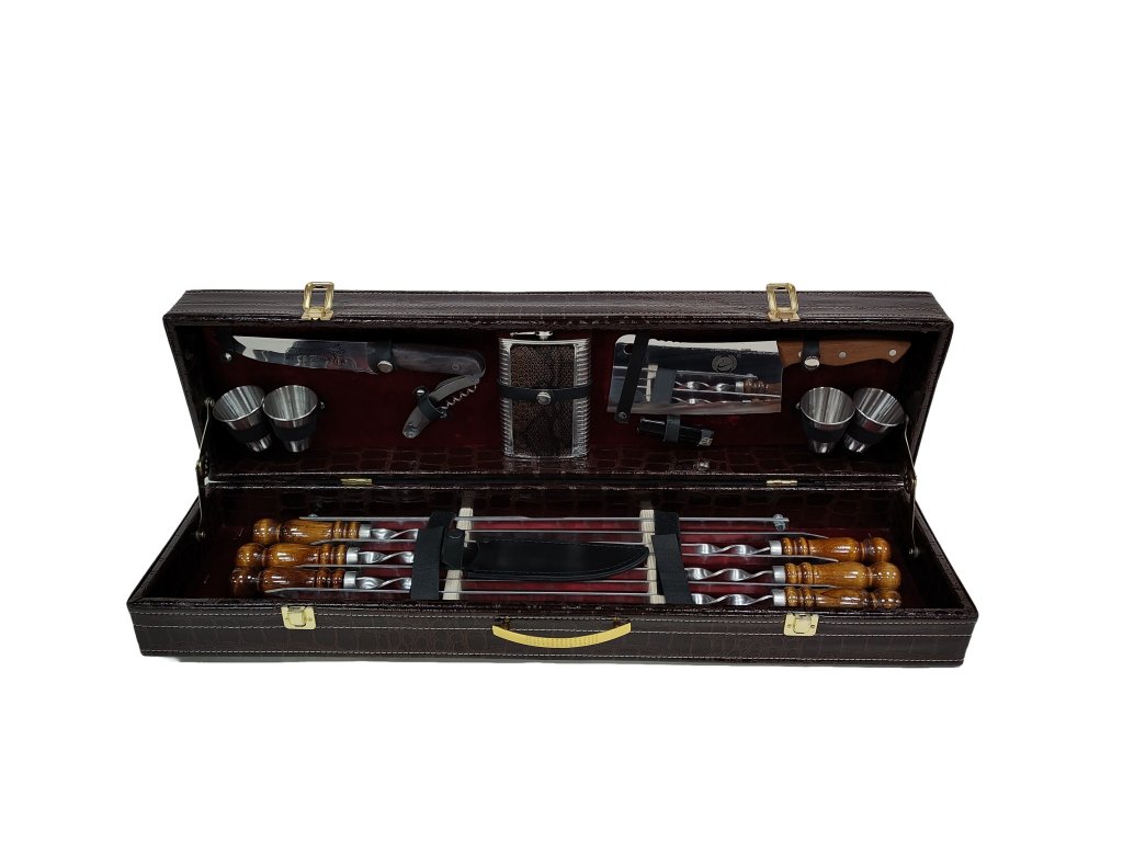 Шашлычный набор 3 | Шашлычный набор в кожаном кейсе — это готовый комплект для выезда на природу, дачи или похода. Всё необходимое для приготовления еды и организации лагеря умещается в одном футляре, который легко взять с собой и не нужно дополнять.