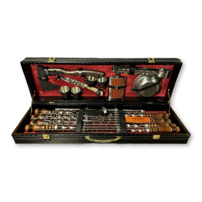 Разборный мангал-таганок дополнен восемью шампурами с деревянными ручками, щипцами для барбекю и решёткой для сосисок и сарделек, обеспечивающей равномерную прожарку. Центральные элементы набора — нож Кизляр из стали 65Х13 и топор «Викинг» с кованым остриём, рассчитанные на интенсивные нагрузки при разделке и рубке.
