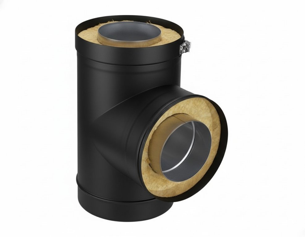 Для дополнительной термальной изоляции используется базальтовая вата датского производителя Rockwool. Она образует плотную прослойку толщиной 50 мм между внешней и внутренней трубами, способствуя соблюдению даже самых строгих норм пожарной безопасности.