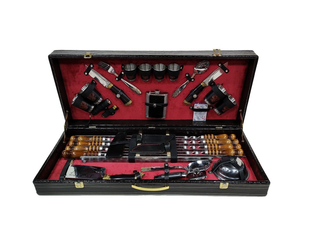 Шашлычный набор 10 (Два Ножа) | Шашлычный набор в кожаном кейсе объединил полную комплектацию для приготовления пищи на открытом огне и сервировки стола на четыре персоны. Это готовое решение для выездов на природу, где не нужно докупать аксессуары.