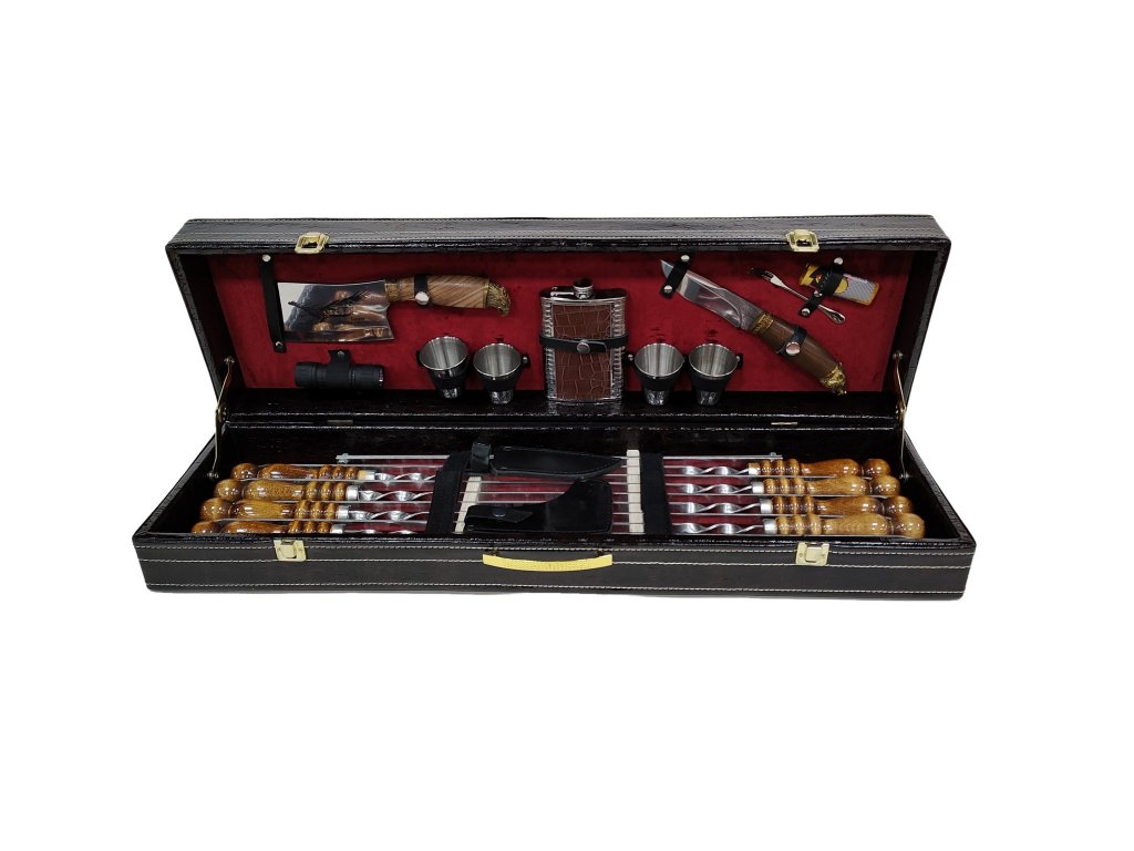 Комплект дополнен четырьмя металлическими рюмками в кожаных чехлах, топором из стали 65Х13 для разделки, флягой с герметичной крышкой, вилкой для снятия мяса, универсальной открывашкой и компактным фонарём. Все предметы надёжно закреплены в отделениях кейса из плотной тиснёной эко-кожи.